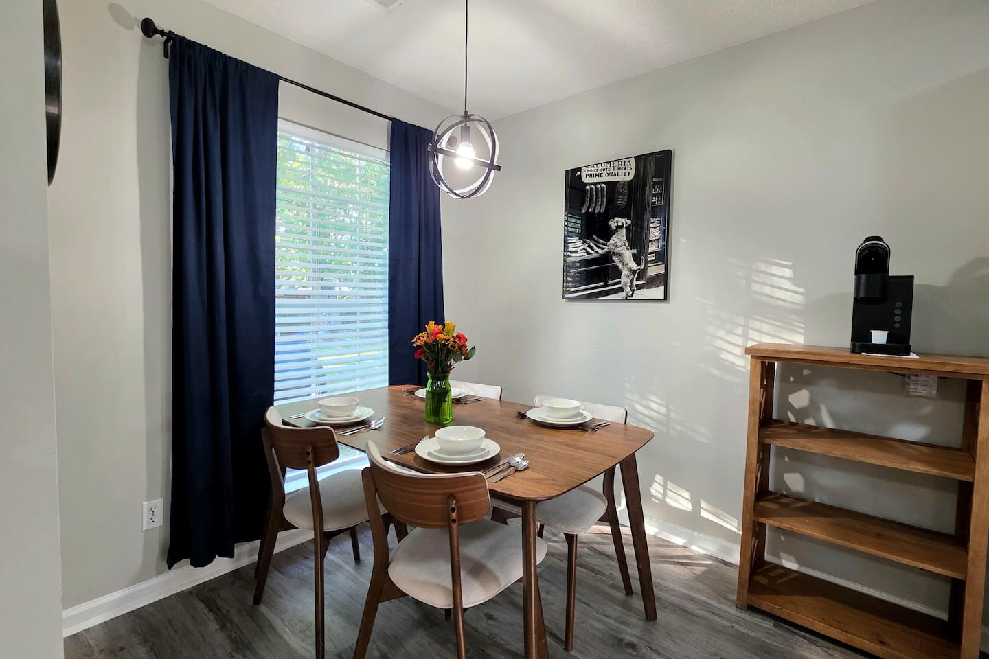 Enjoy a fully stocked kitchen, coffee bar, and dedicated workspace for remote workers.
